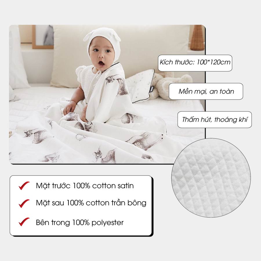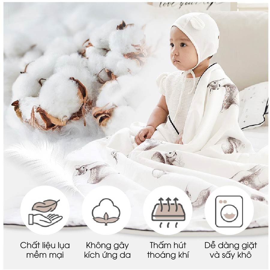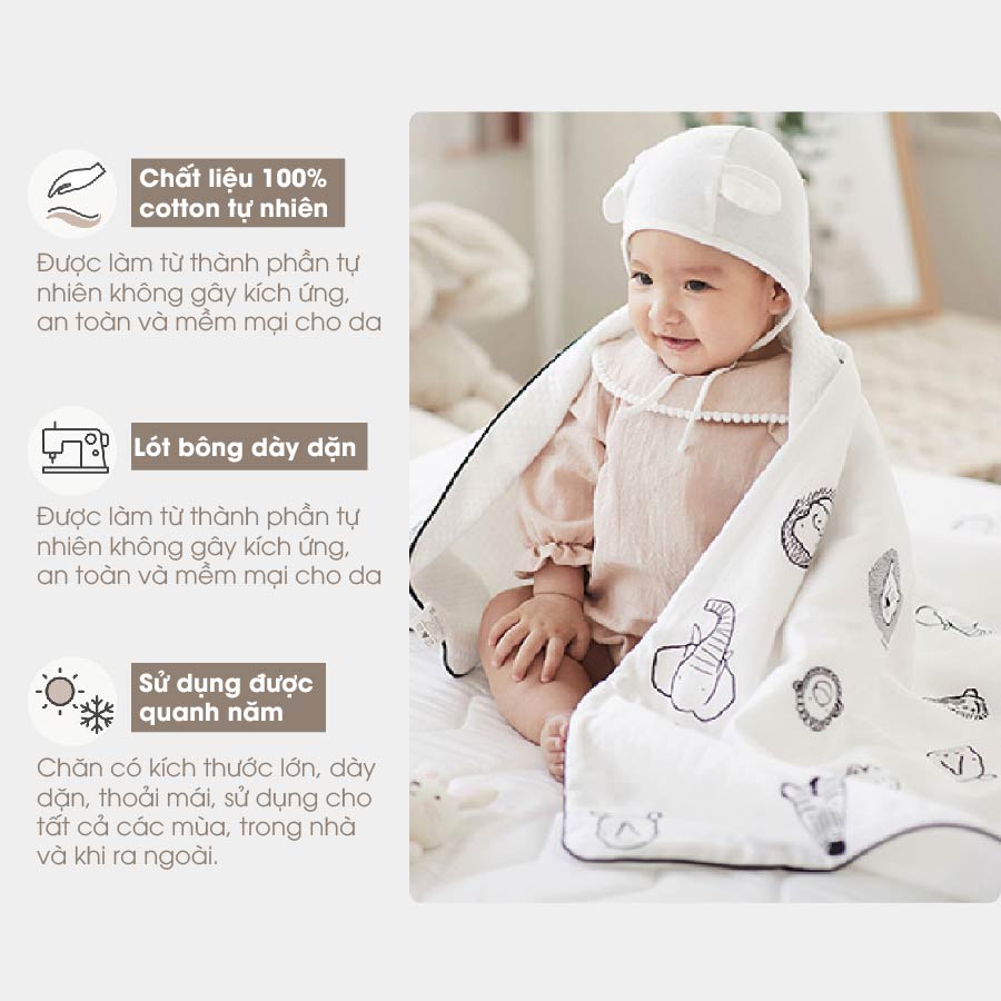 – Chăn được làm từ chất liệu 100% cotton cao cấp nên độ bền cao, an toàn tuyệt đối, có thể chống dị ứng và tạo cảm giác thoải mái, dễ chịu cho bé khi sử dụng.