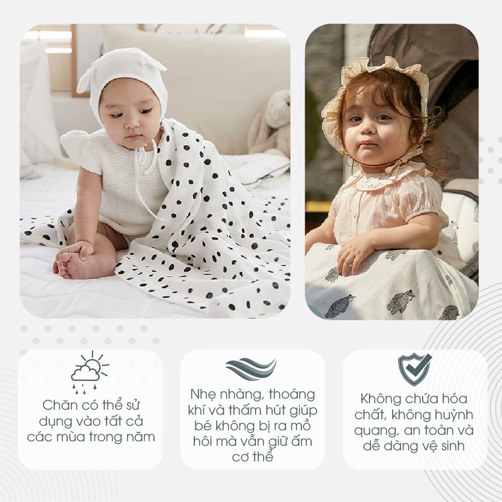 – Chất liệu vải dệt từ gạc 2 lớp tăng thoáng khí và khả năng thấm hút không quá dày cũng không quá mỏng, tạo cảm giác thoải mái cho bé khi tiếp xúc với da.