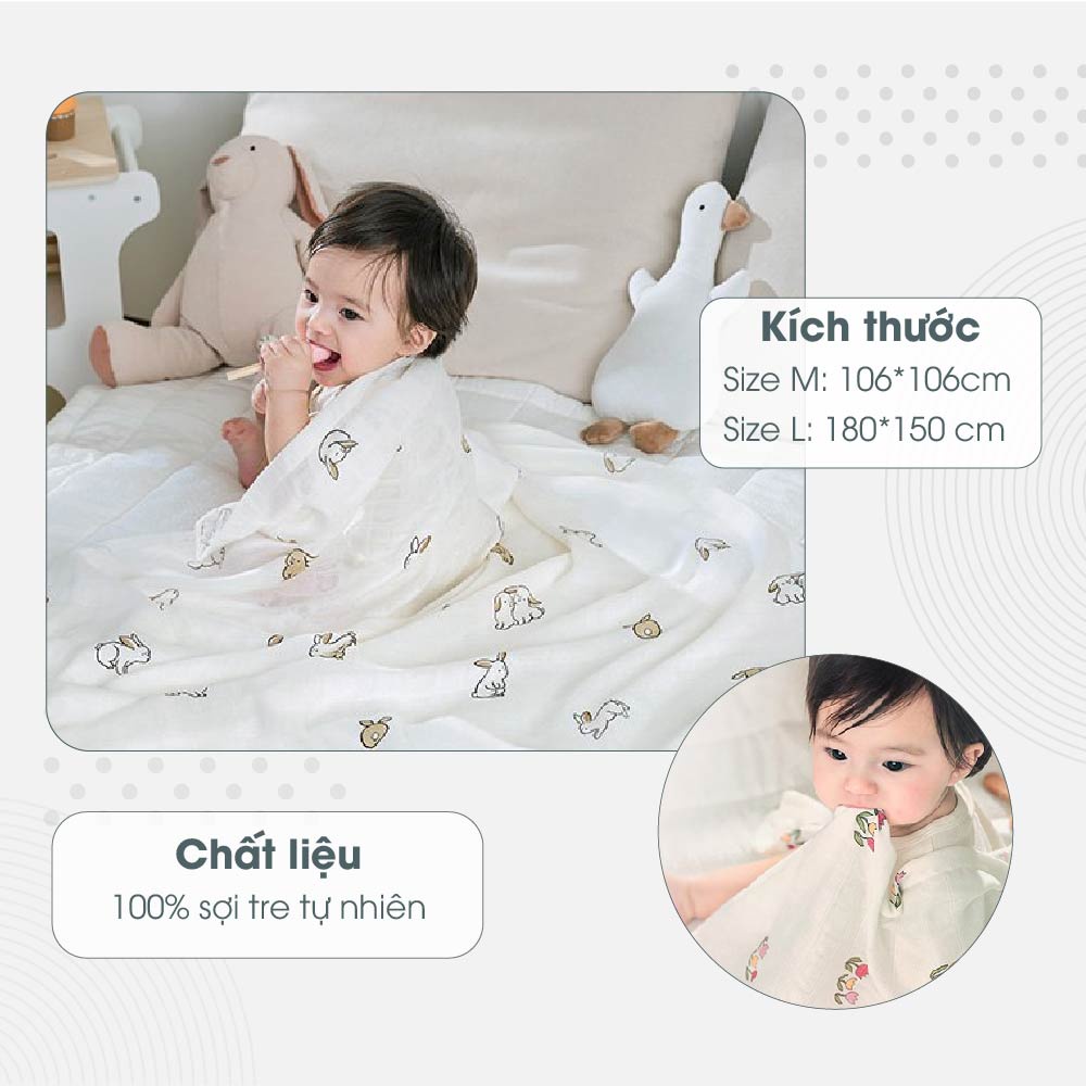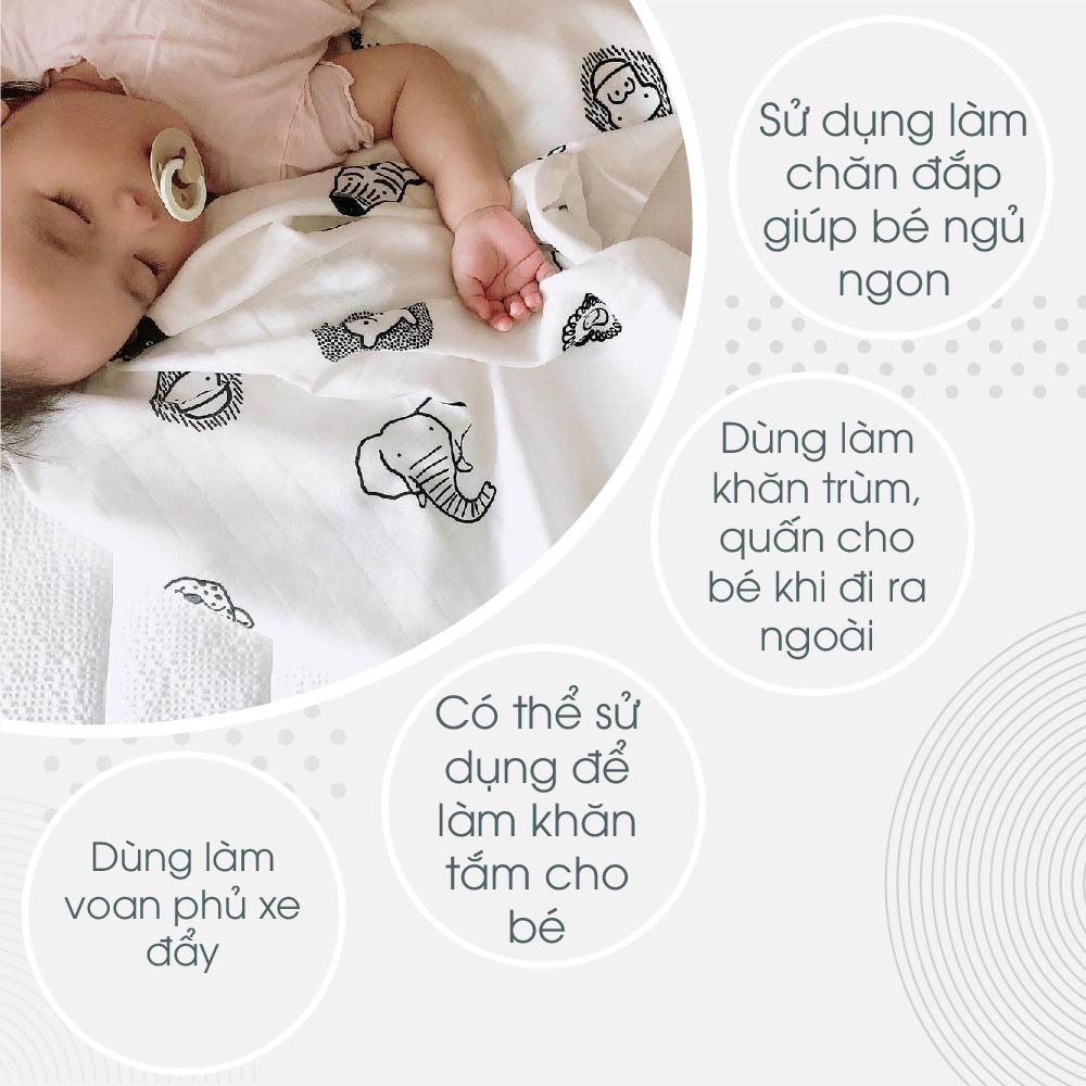 – Kích thước lớn, sợi vải mềm mại và thoáng mát, thuận tiện cho các mẹ lau khô đầu, lưng hay quấn cơ thể cho bé sau khi tắm hay khi bé ra mồ hôi mà không lo ảnh hưởng tới làn da của bé.