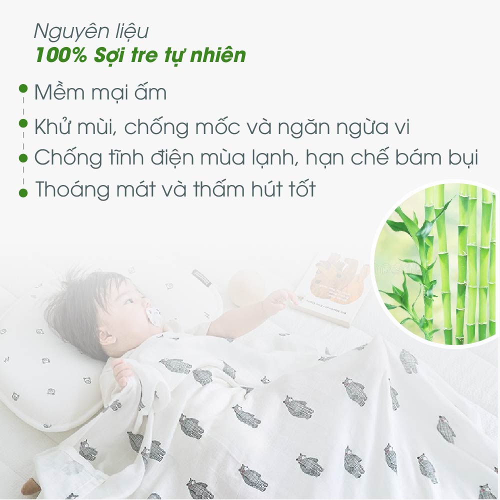 – Chăn được làm từ 100% chất liệu vải sợi tre cao cấp sẽ mang lại cho bé sự thoải mái, tươi mát mà vẫn giữ được nhiệt cơ thể đồng thời cũng bảo vệ làn da của bé trước những tác hại của môi trường xung quanh.